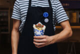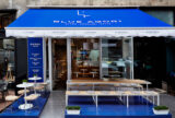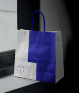 The takeaway bag is equally a statement: instead of featuring the full logo with the readable name in large format, it emphasizes the blue, abstract facial profile.
