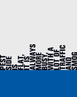 His approach reduces Budapest's topography—its roads, bridges, geographical, and architectural landmarks—into abstract symbols and text. For instance, the Danube becomes a long blue stripe, while the city's iconic curved tram line is depicted as a yellow arc. Buda is portrayed as greener and more hilly, while Pest is flat and more densely built, with the two sides divided by the flowing Danube.