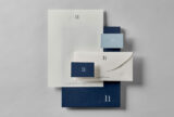 The interior design reflects classical elegance, with the brand’s colors – dove gray, imperial blue, and light blue – partly featured in the furnishings. These same colors are also incorporated into the brand elements, such as in the stationery, maintaining a consistent visual identity throughout.